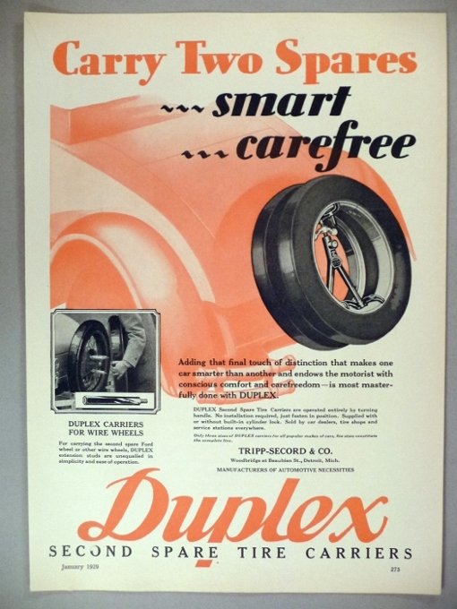 Interesting, thanks for clearing that up Frank! I was hoping it would attach to the side of the car, since I have a ‘16 touring with Demountable’s and I don’t have the rear tire carrier. And one won’t work on this car because of the tail lamp location. What I really need is the carrier below the Duplex ad you attached, that mounts to the running board! Anyone have one by chance???