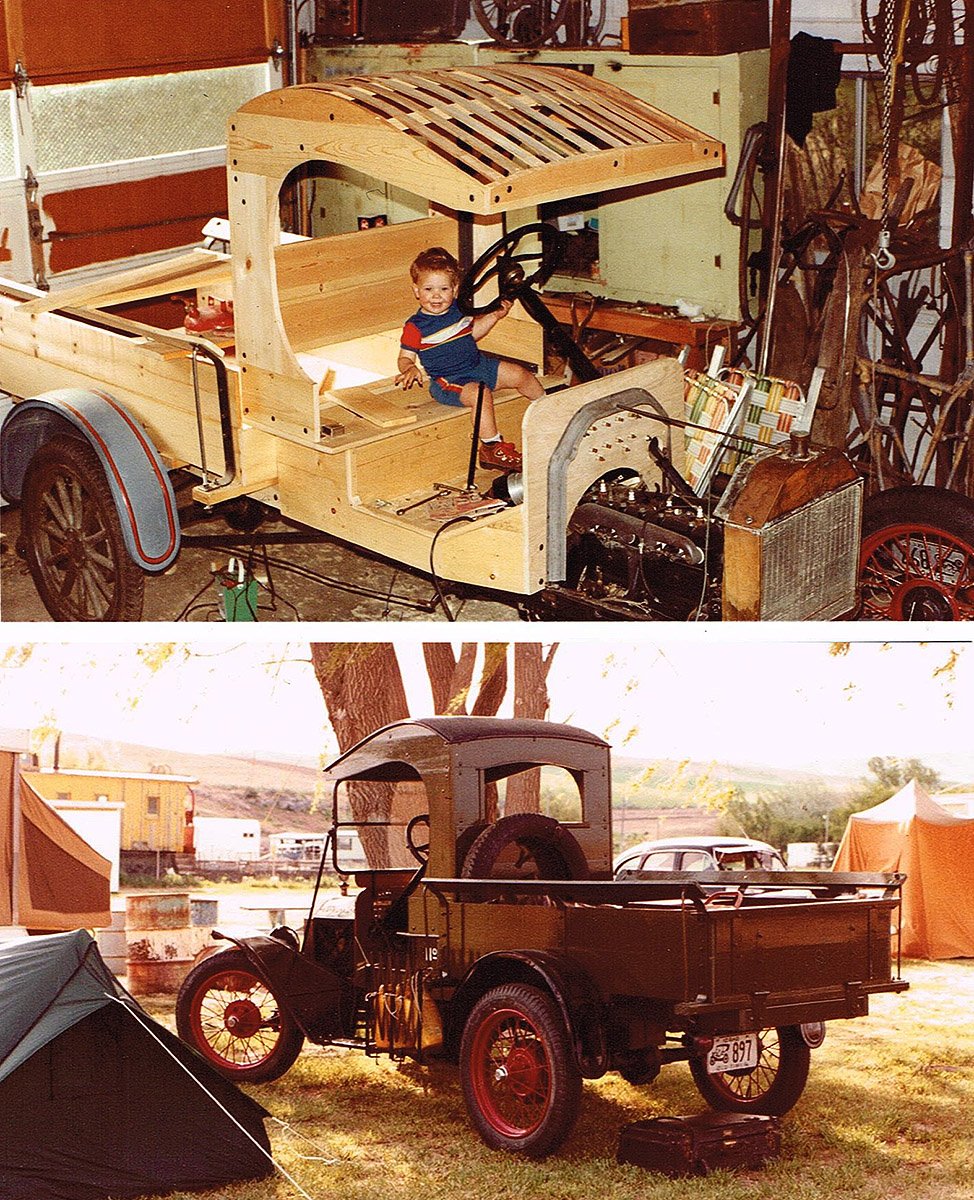 There were some near disasters. One young fellow rolled his racer and ended up in the hospital. It was not on a race but on a car tour. In 1978, I married Joy and she happily became my co-pilot. After some close calls, I decided to quit racing. I had certainly pressed my luck. The maroon and black color combination was finally replaced with gray. We continued to drive the racer regularly to breakfast and club events. It had survived and preformed wonderfully over the years. In 1982, it seemed time to fit a different body on the chassis. I took the racer remains to our swap meet. Lewis Rector found the body delightful and purchased it. He didn’t ask its history so I didn’t want to disappoint him with the fact I had bult it. I was pleased it looked like an old original. I used the funds to buy enough pine to build a C-cab express body. The C-cab was painted green with black fenders. I put the number 28 on it to look like it was part of a fleet of some kind. It looked official enough that one old timer said he remembered those old telephone trucks. I drove it often to the salvage yard and picked up all kinds of T and other parts on weekends. We would pick up our Christmas tree each year in it.