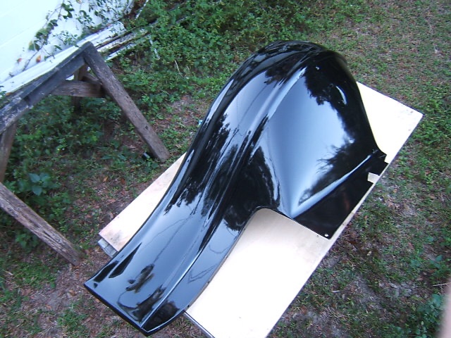 This fender was painted 13 years ago with Rustoleum High Gloss Appliance Epoxy. This is one coat. There was no need for a second coat. I used one can and a little bit of a second can I had ready and sprayed, continuing to spray over areas of overspray until the entire fender was wet. As Wyatt Earp said in an interview in which he was asked “what makes a successful gunfighter?” “You take your time in a hurry.” That is the approach to this type of painting. Go fast enough with several passes to get the paint thick enough to have a nice smooth uniform finish without runs and don’t try to do too big an area at one time. This fender is about the maximum size to achieve this type of result. Better to keep the area smaller, rather than larger. If you try to do too much, the overspray will start to cure before you can get back with another pass to re-wet and build up the coat.