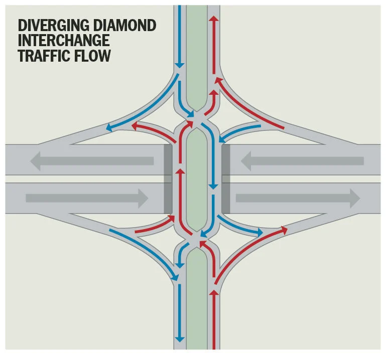 Now that the "round-about" has returned to our roadways in place of 4-way stops in many intersections. The next generation of change to the clover-leaf is the Diverging Diamond where for a brief moment Americans will be driving on the Left side of the roadway.