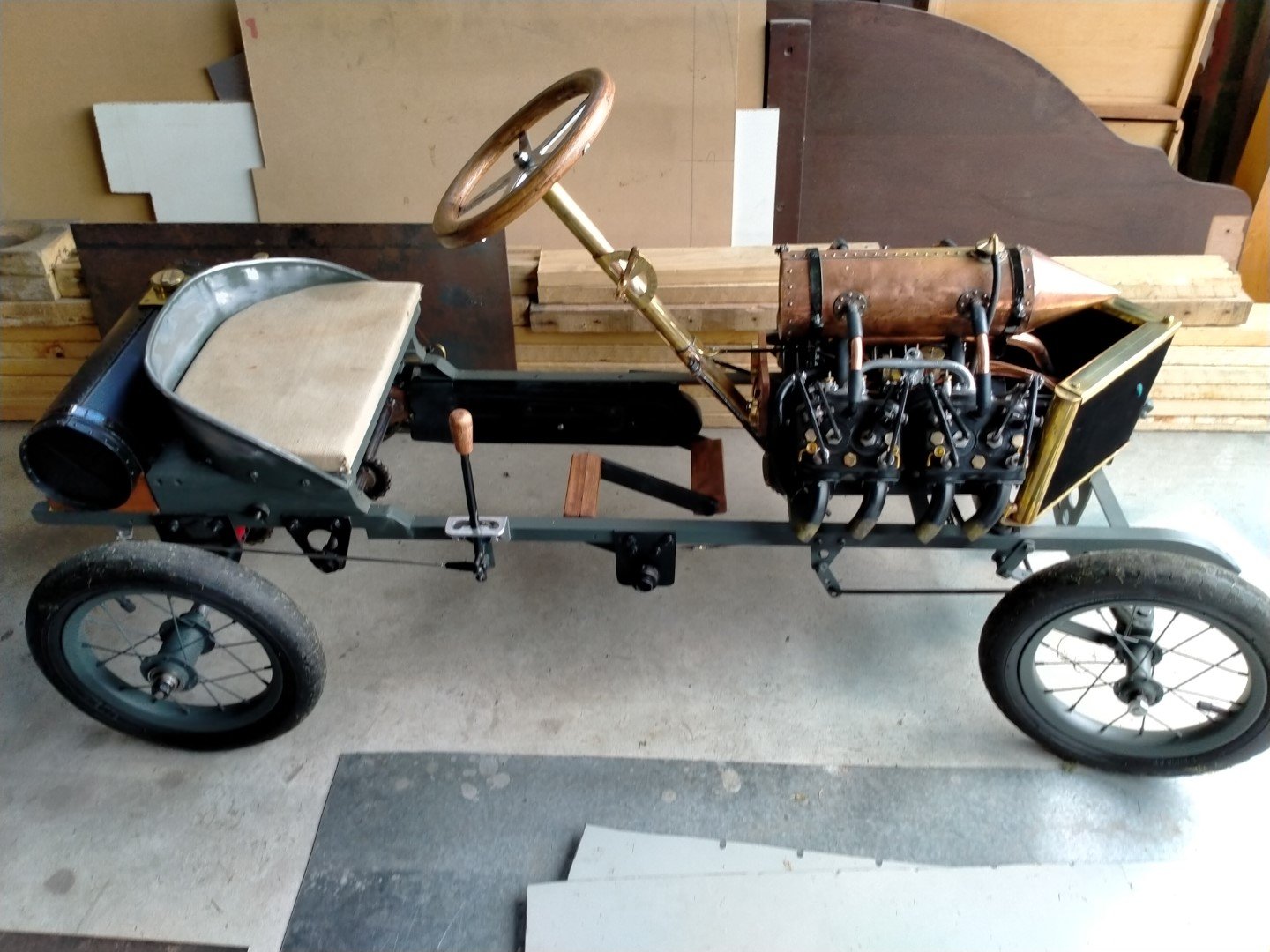 A friend of mine is constructing a child sized pedal car of the Noel Bullock 1922 Pikes Peak race car. His interest in building the racer is to make the complete drive train shaft and gear driven instead of typical chain drive. He also wants to detail the engine as much as he can. Stu makes fabulous replicas of older race cars with as much authentic detail as he can using recycled and repurposed items.