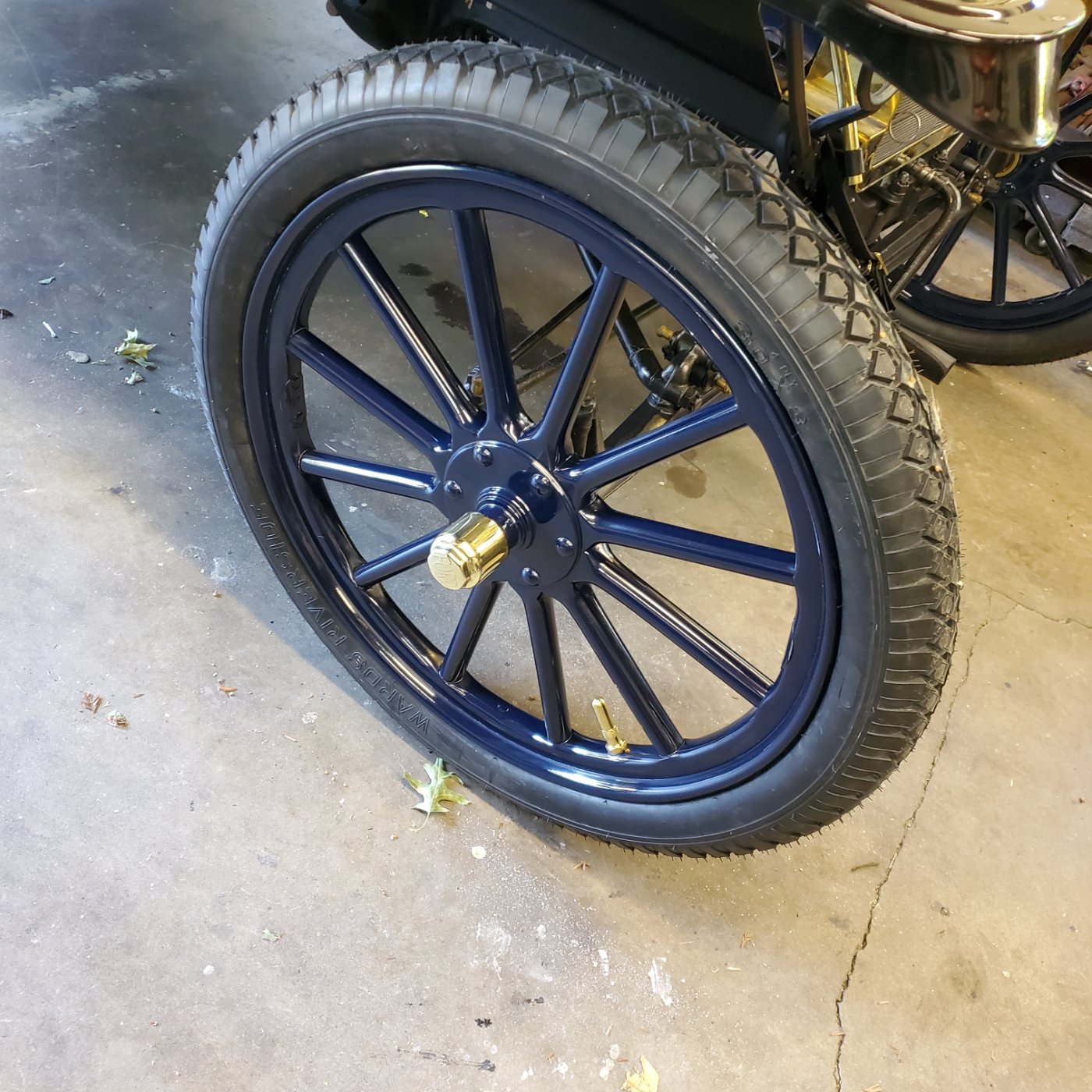 I plan on showing this car with my 1912 touring and my 1912 delivery, both have wood wheels with white tires. All painted and stripped the same. I kind of like the sportiness of these wire wheels but I was thinking about all three cars matching. I really value all of your opinions.