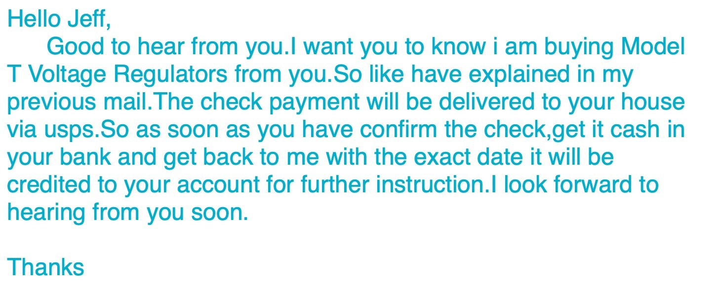 So I was contacted by a Wolfgang Mischke wanting to buy several Model T Voltage Regulators. No red flags, I get LOTS of inquiries, sometimes from distributors, sometimes foreign countries like New Zealand, Japan, UK, etc. I'm selling a dozen of them to a real Australian distributor.