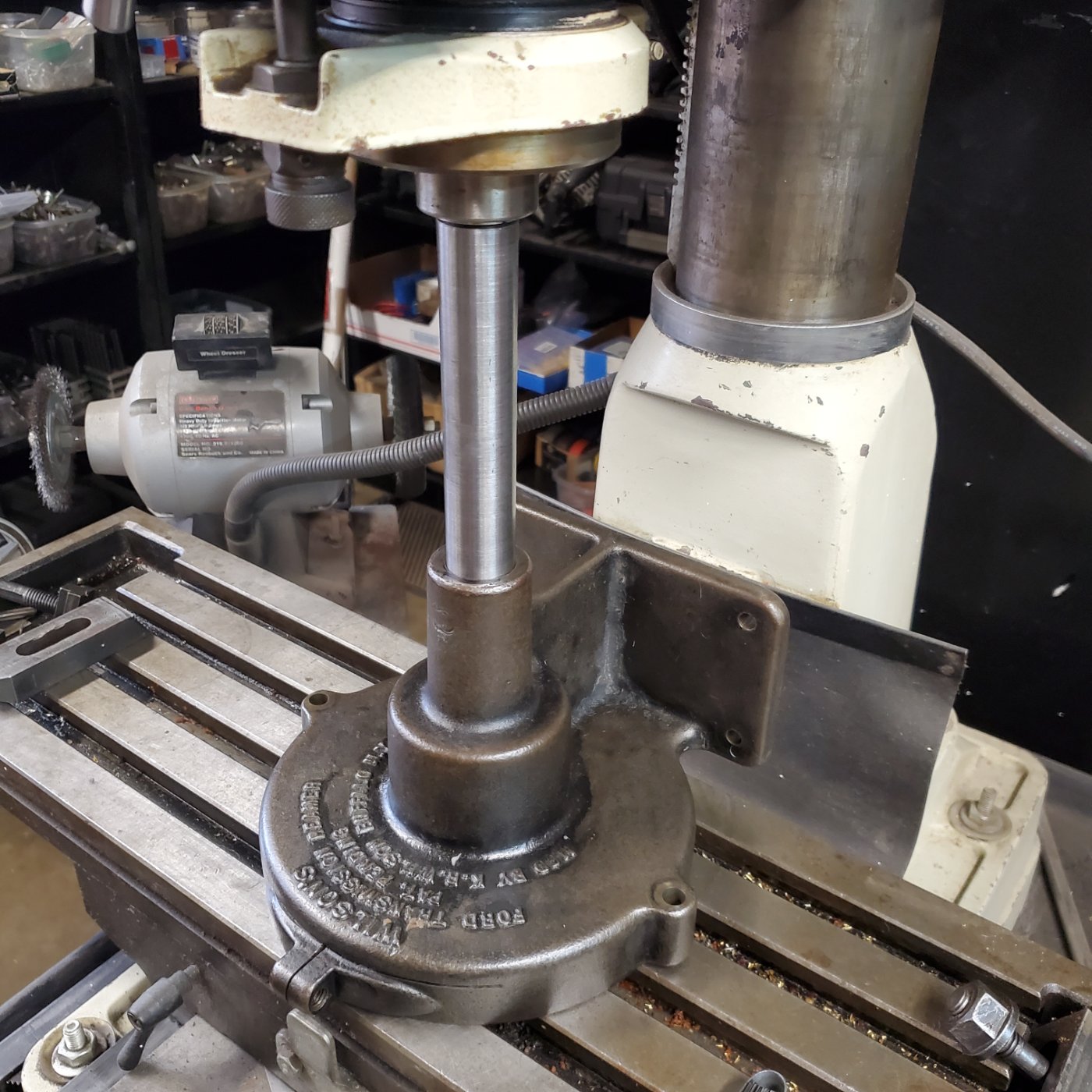(the third) was long enough to allow mounting the rotary table, the chuck and Wilson fixture on the bed when finished. The vertical travel on the mill drill is only 5 inches requiring raising the head to allow clearance.