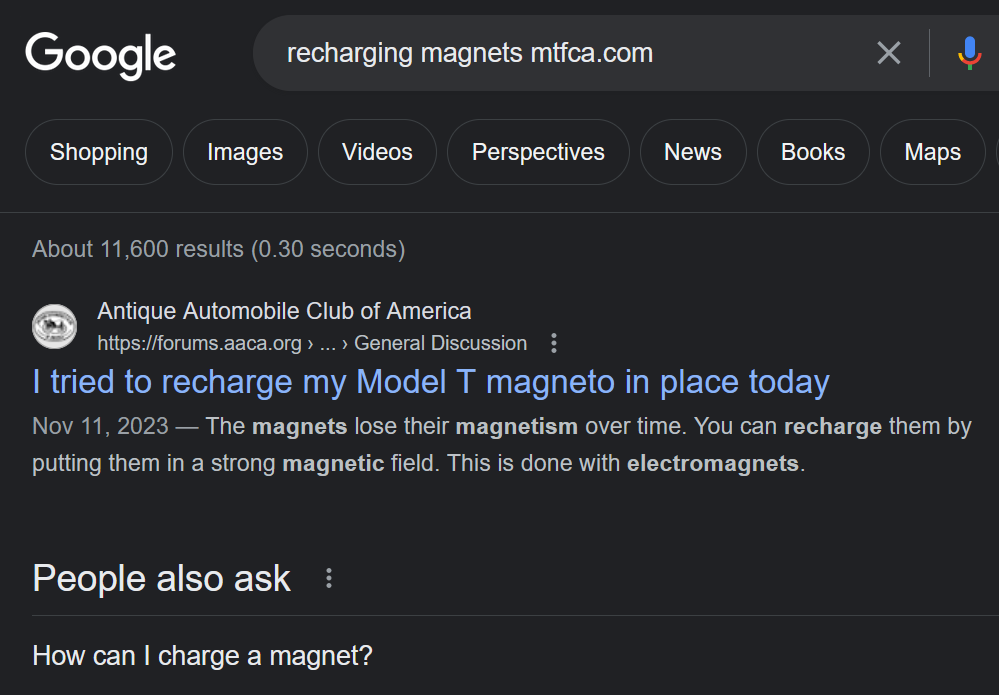 You are right. I just tried a general search as I sometimes do. I have always used a Model T topic such as magnets, transmission or etc plus MTFCA and always earlier forum answers or newer would come up.