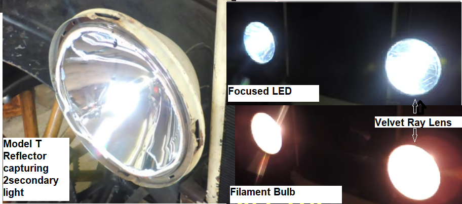 The filament bulbs light source is adjustable to be at the focal point of the reflector for optimum light distribution. This is necessary for any type of bulb dependent on using the reflector. Its easy to see that the Focused LED lens is well beyond that and the reflector is just capturing light emitted from lens glass. The picture below shows the difference in how the headlight reflector illuminates the Headlight lens making the Filament bulb look brighter. So these would be better for those wanting daytime running lights vs night driving. --