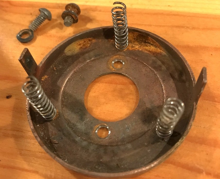 Do you have these springs? The center round piece may noy have a spring like mine but needs something to keep it pressed against the backing plate to make contact (band type spring?). The screws hold the plate to the internal part that is rotated by the handles --