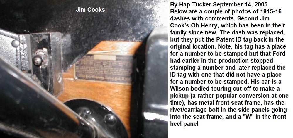 "The engine numbers and the number stamped onto the ID/Patent plate usually matched from at least the 1906 Model N and later R & S cars. But then sometime around 1911 or so I think -- I need to look that one up, they started to diverge. I have never found any reason listed for why they began to diverge but sometime along in there or shortly after that they did. By 1915 they had gotten quite a bit different even to the point that on Apr 29, 1915 they issued a factory letter stating, "On or after May 1, the use of body numbers will be discontinued (by Ford) and no records will be kept of same." See Bruce's on line encyclopedia at: http://www.mtfca.com/encyclo/doc15.htm That is why I thought your car would be an early 1915 -- as your plate still had a number stamped onto it. They continued to use the same plate -- but they just left the area blank -- which is shown with Jim Cook's early 1916 ID plate above. "