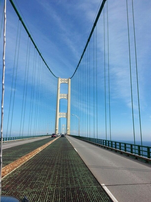 The Mackinac Bridge is about five miles in total length, and it was the longest suspension bridge in the world when it was built. The outer lanes are covered, the two inner lanes are open grate, which allows the wind to pass through, helping stabilize it. It also lets snow fall through, reducing weight. It can be intimidating to drive over, and there are drivers on call to drive your vehicle across while you hide! I talked to a gentleman who did this job, and he told of driving everything from motorcycles to semi trucks across it. The truck driver hid in the sleeper unit and told him how to drive the truck from there! He had never driven a tractor trailer before, and this one was loaded! It is a toll bridge going north but not south as I remember it.