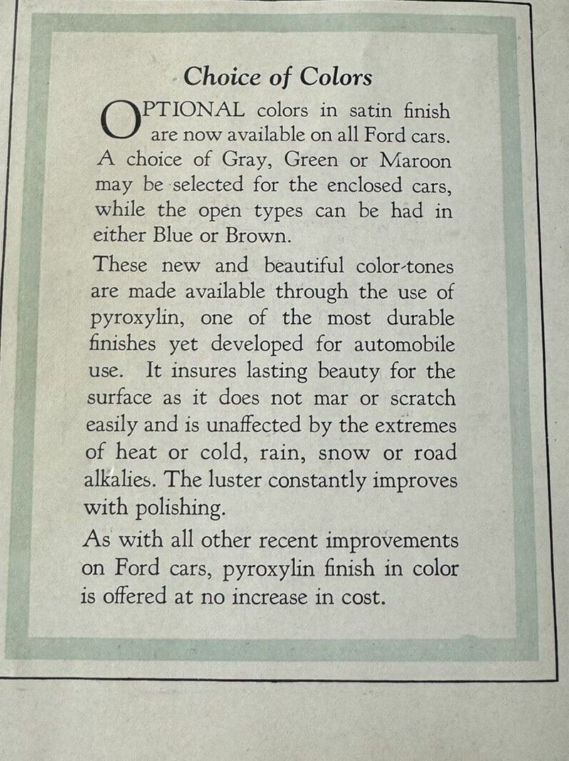 I have a 1927 Coupe that is painted Channel Green, and I came upon a very interesting 1927 Ford sales brochure that described the "new" paint colors for the Improved Ford. In the brochure, it describes the paint finish as a "SATIN" finish, which, to my knowledge, has not been described before. I'm wondering if anyone restoring a 1927 Ford has painted their car using a satin finish paint? I suppose we could debate what a satin finish would look like, but it does not say the paint finish has a gloss. I've attached a copy of the document. Russ Furstnow