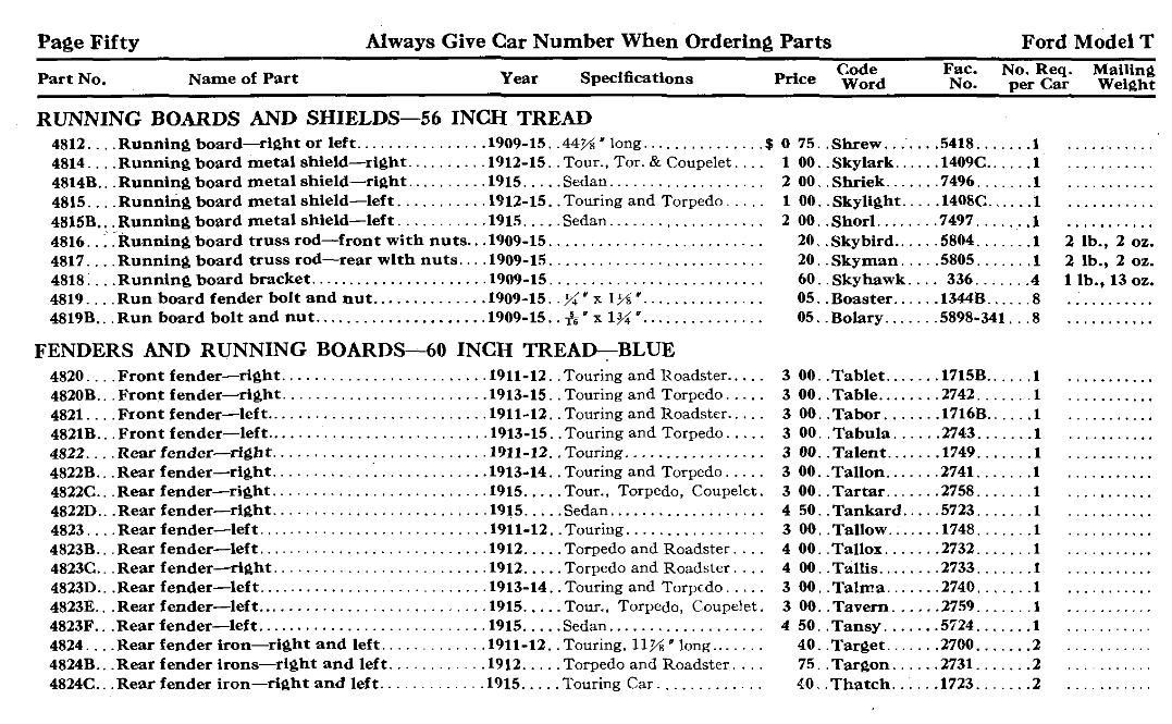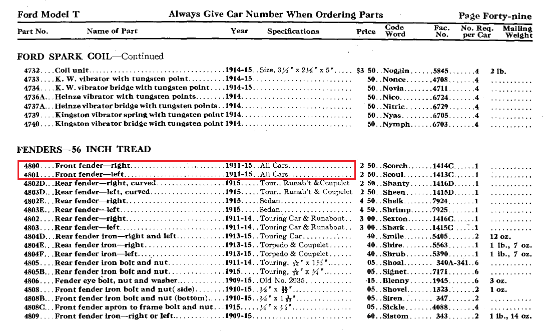 I checked the 1920 parts book and found that the rear fender irons are the same from 1913 through 1920 and both the coupe and the roadster used the same iron. When I measured from the top of the front and rear fender irons I get the measurement of front 34 1/4 inch and rear 37 3/8 inch. from the floor to the top of the fender irons. That means that the rear fender sits 3 inch higher than the front fender, Is this what it is supposed to be? I have wire wheels both front and rear are 30x3 1/2 but that should only make a difference of 1/2 inch.. I don't have access to a 14 roadster to check to see if both fenders are the same height from the ground. The same parts book lists the front fender iron Right or Left from 1909 to 1920. Before I started the restoration I checked the frame to be sure it was straight, and it is.