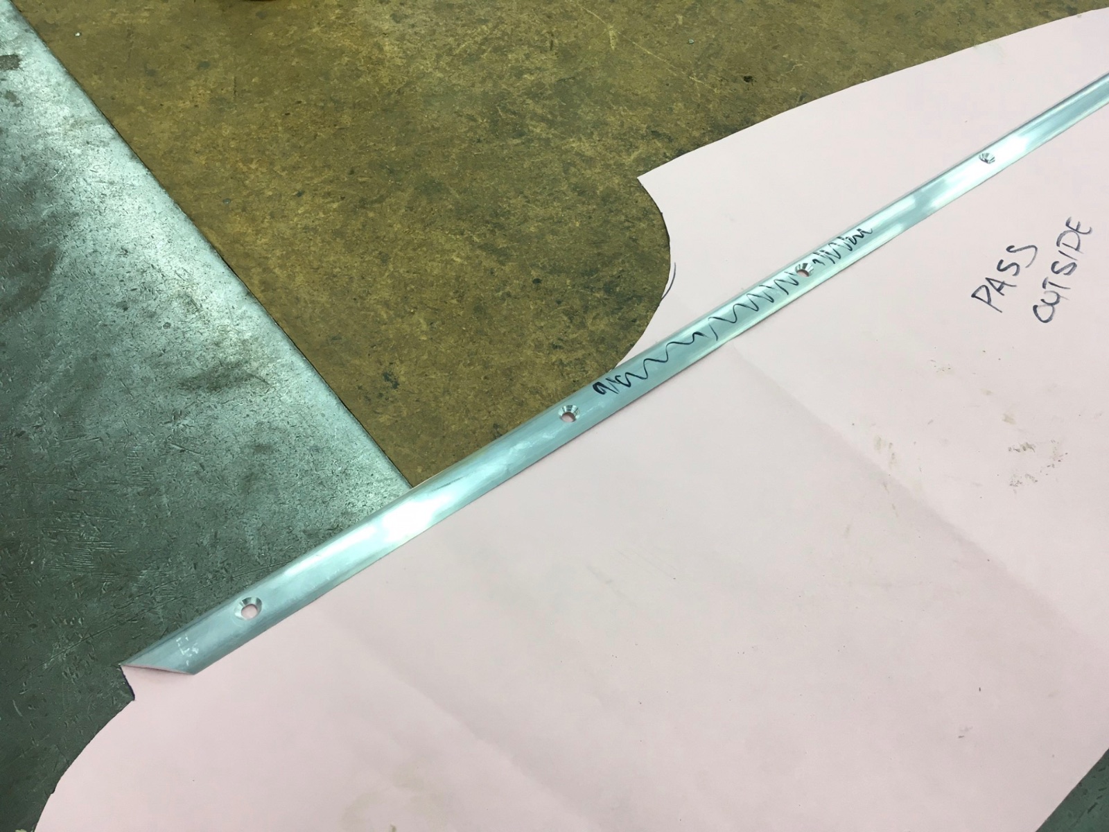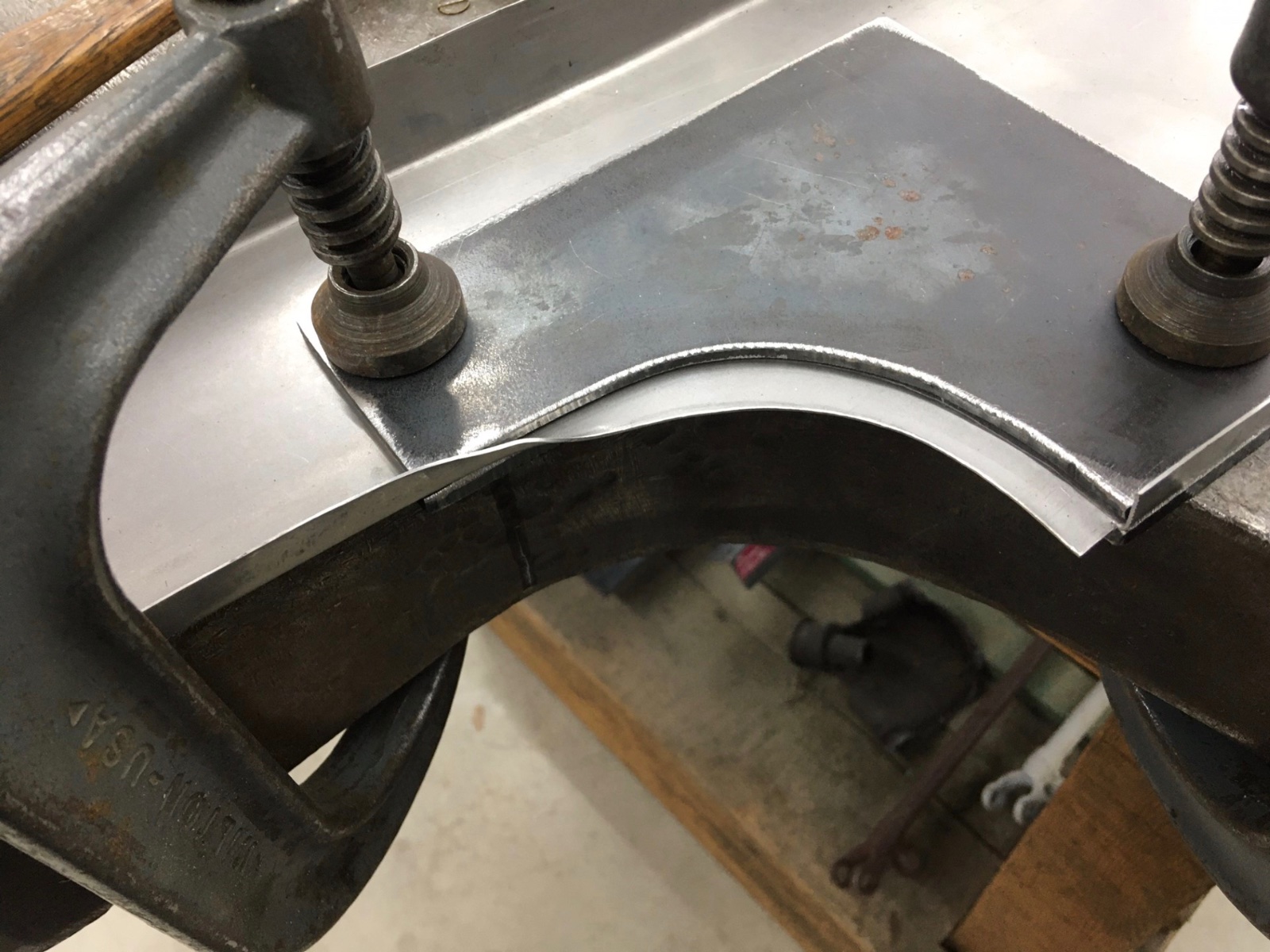 Since I don’t have a 8’ brake at home, I sandwich a 1” flange between two 3/16” strips and knock down with a rawhide hammer, checking to see it is approx. 7 degrees short of 90.