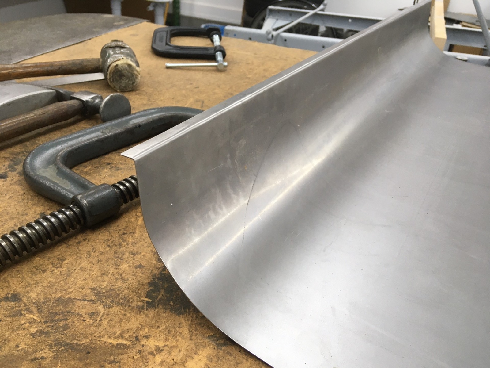Next knocked down a 3/8” flange and clamped a 4” pvc behind it and pulled the sheetmetal around it to give it the upsweep.