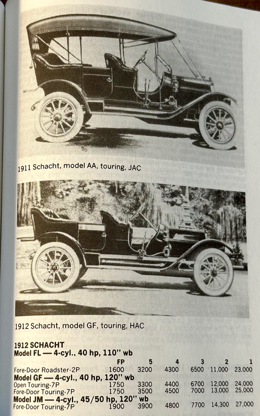 The early Schacht automobiles were 2-cylinder with the engine behind the front seat. The car cranked from the back of the car and had springs like the curved dash Olds from the front axle to the rear axle. Most were high-wheelers with solid rubber tires. The 2-cylinder Schacht was friction drive like the Metz. The 4-cylinder Schacht pictured here followed the 2-cylinder was more conventional and was short-lived. They are quite rare today.
