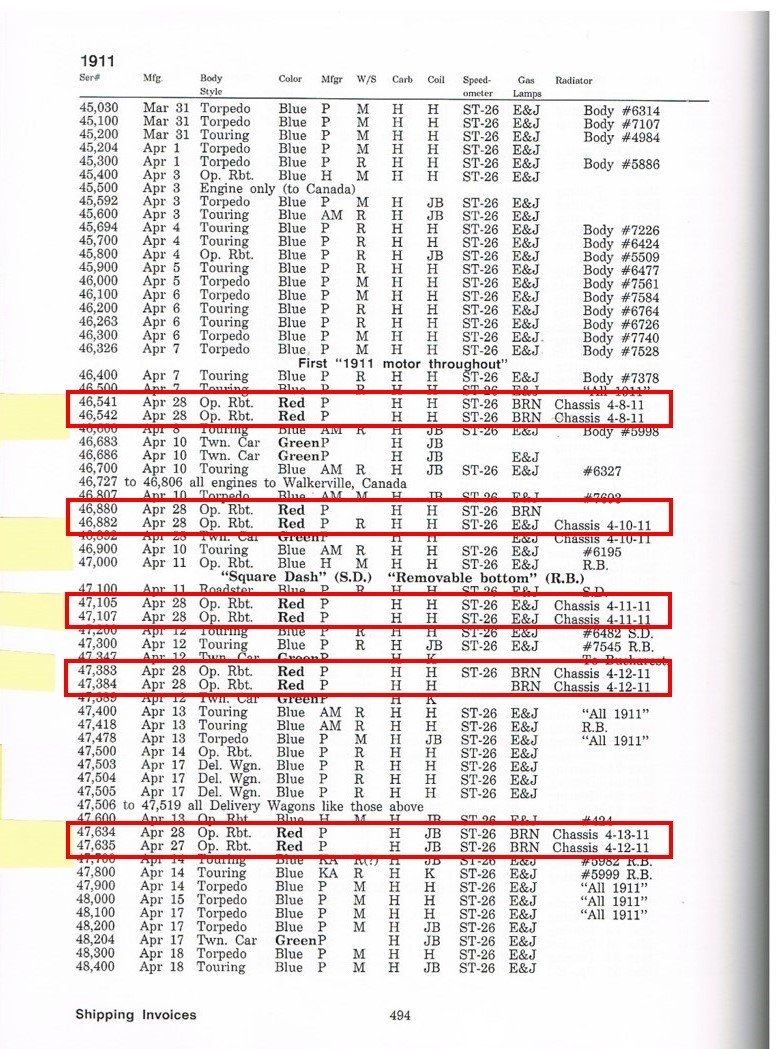 Below is from Bruce McCalley’s “Model T Ford” book and shows the 10 red open runabouts that were ordered without a windshield. They were manufactured on Apr 27 & 28 and were all painted Red.
