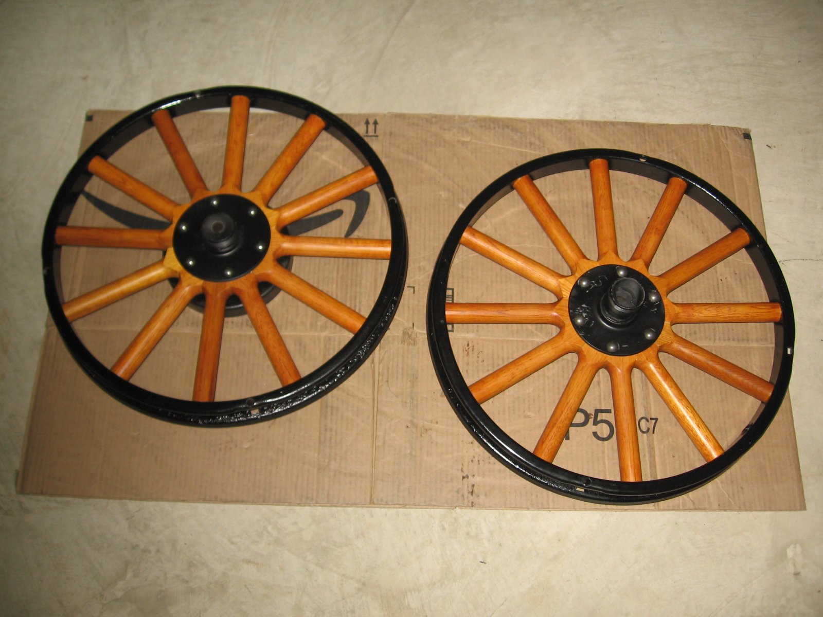 Canadian wheels are much easier to assemble. There is no need for a press. When the spokes are assembled ready to fit over the hub, the front to back taper on each spoke allows them to be tapped down with a mallet. First, those spokes with the wide side of the taper next to the hub backing plate can be tapped down somewhat, and then the alternate spokes with the wide side out can be tapped down to meet them. The process is repeated as often as needed until all the spokes are in position on the hub.