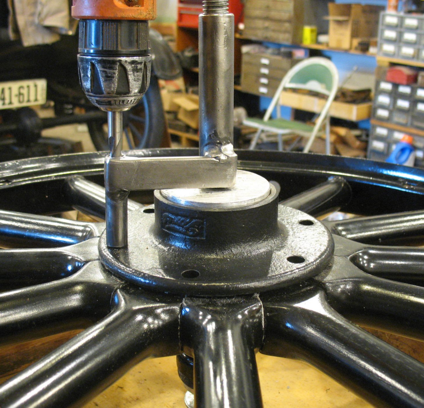 Would it help maybe, to have a long bar, with 2 studs protruding, that would engage with the 2 of the 6 hub flange holes? A helper could manage the bar and use it to "steer" the hub, preventing it from rotating and allowing the spokes to skew. Obviously, the felloe would need to be restrained as well.