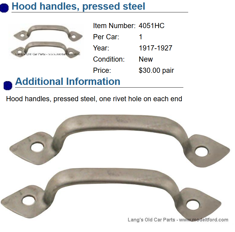 No hhandles on my former depot hack hood. Vents all the way along the side and fits radiator and hood former of this 26/27 donor vehicle. But when I look at what the vendors offer for this, and almost every other year hood, each handle appears to attach with two small rivets at each end, or four rivets for each handle. But my hood only has one approx 1/4" hole at each end of where it felt the former handles would attach.