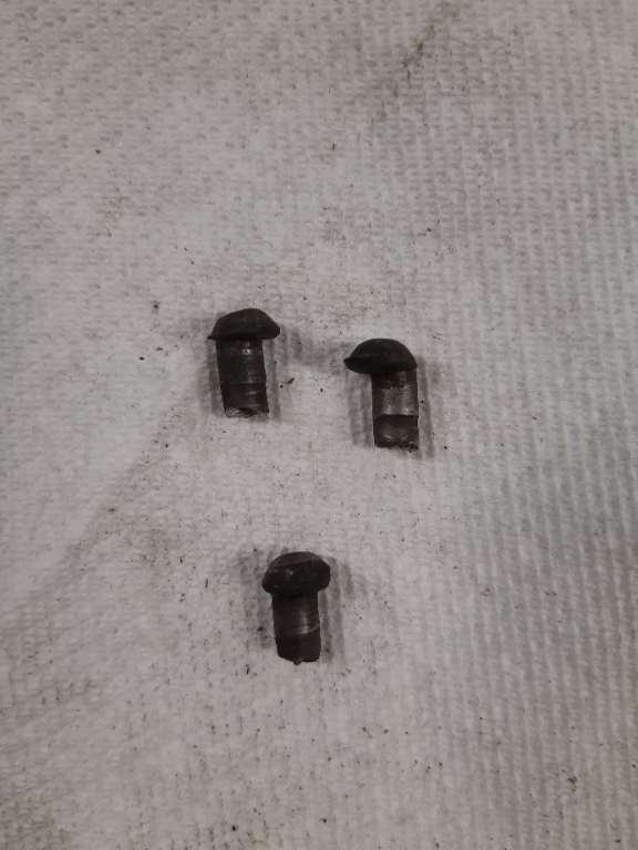 When I took two of the housings apart it was obvious that these rear end rivets did not have good clamping force unlike most frame rivets. When removing frame rivets, I usually have to drill most of the way through then use a punch and hammer hard to get them out, and they are hard to get out. When removing the rear end rivets once the head was ground flush, the rivet could be easily punched out with a drift. They were NOT tight from the factory. And see the picture below of some of those removed, many were not even pressed squarely from the factory. The shape of the rivets showed that they were pushed in from the outside and then pressed on a fixture to mushroom the inside end of the rivet. And most were not even close to being on center.