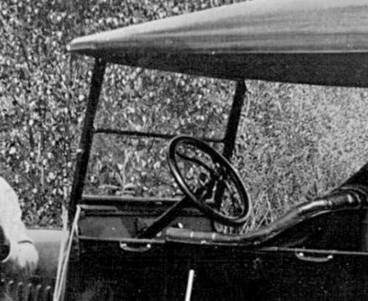 Note the lower part of the slant windshield is hinged to pivot out like the 1920-1925 Canadian open cars. US and English cars did not have that feature if I recall correctly (please chime in if I have that wrong or you know that is correct). The car has the door protectors the Canadian open cars 1920-25 had. It appears to have the horn button on top of the steering wheel. You can see the rear top window is rounded and NOT straight as a rectangular window would be. It also had the loose lug wheels (some USA cars also had the Kelsey loose lug demountable rims and two other styles of loose lug wheels depending on the manufacturer).