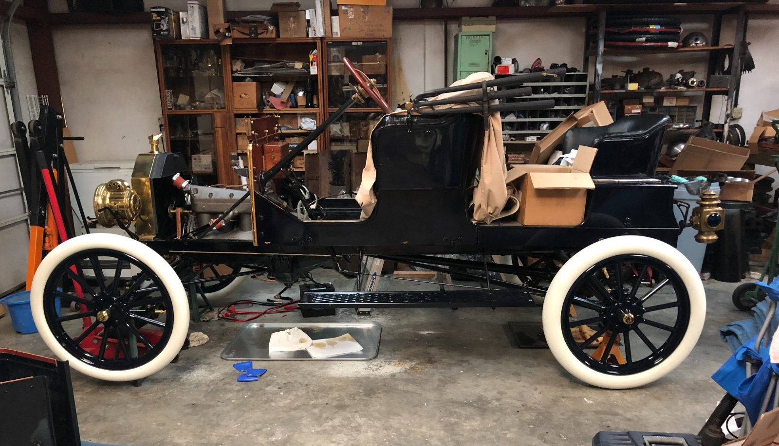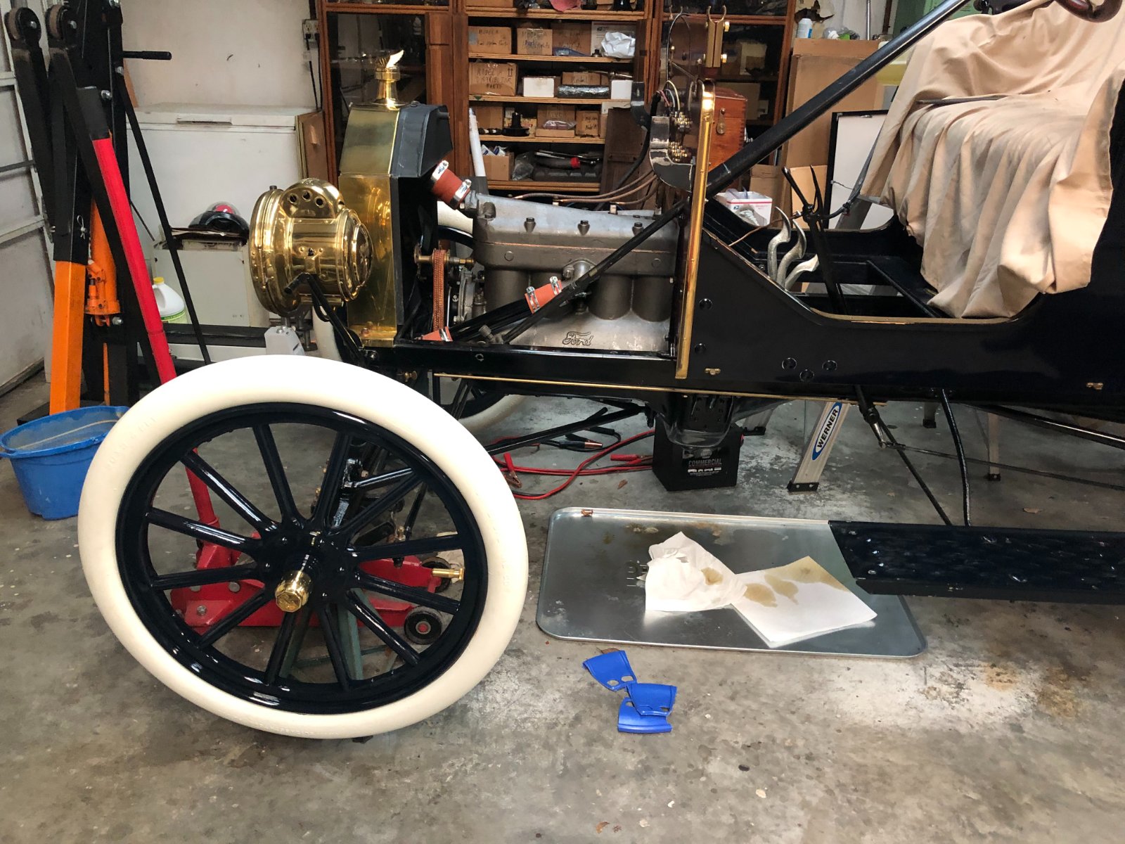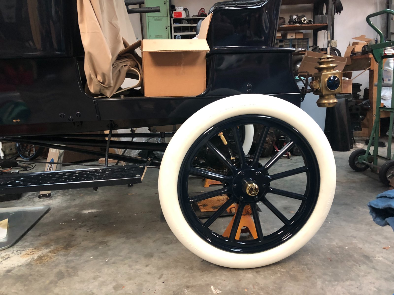 With the help of a good friend, got all four tires mounted on my 1912 Runabout. There is such a psychological boost to getting the wheels and tires done. I think she looks pretty sweet with her white shoes on.