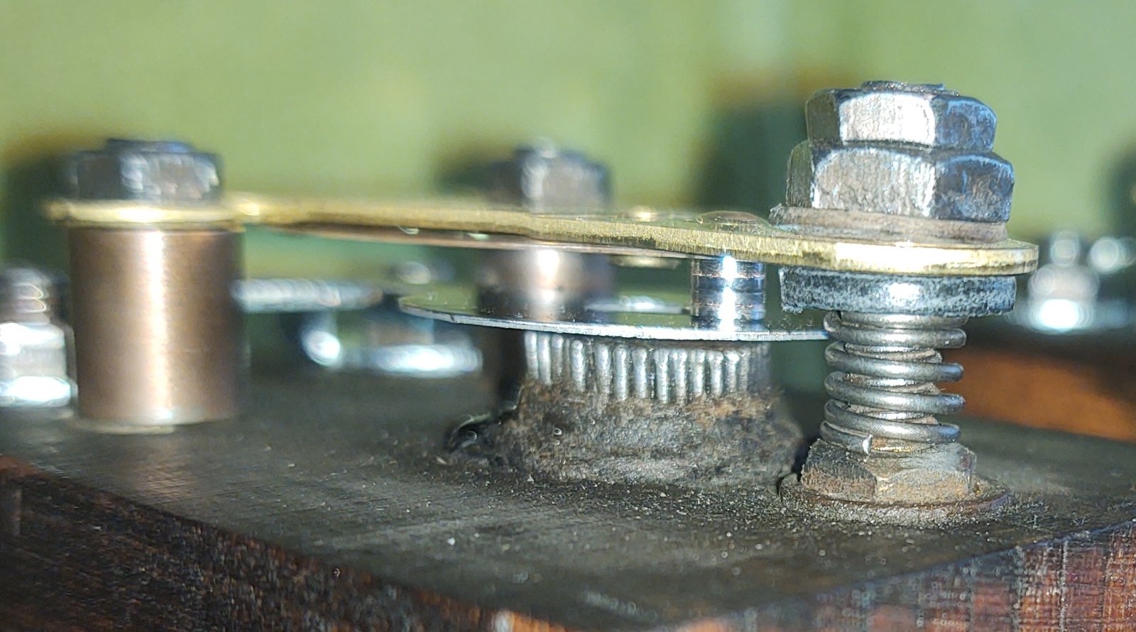 K - W style coils...... Refurbishing ignition coils is more than just replacing the top hardware. Hopefully by this point you have checked the capacitor, and or replaced the capacitor, checked the secondary coils for 3200 ohms, besides cleaning and polishing the three coil contacts that connect to the coil box..... The current run of KW coil points are a lot better than past production. The cushion spring has been more closely adjusted to average 0.010" clearance. Tension on the vibrator point and the cushion spring tension would have to be adjusted for electrical values..... Save your upper bridge coil points, you can snip off the attachment and use those as washers underneath the standoffs to compensate for wood compression so the new bridge will horizontally run parallel with the top of the wood coil case. Depending on past tightness, wood dehydration, or physical injury, ... two washers may be needed. After wire brushing your standoffs and post nuts install your new coil point set and be sure to have the points mate in exact mating position ...... Using your hand crank coil tester, achieve single spark and 1.3 amperage readings.