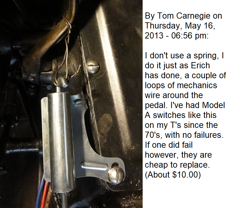 I would like to upgrade the brake light switch setup on my 27 T. Currently it has a switch mounted on the crossmember behind the transmission and there is stiff wire going from the switch through a hole drilled in the brake pedal. The set up is not too dependable and somertimes stays on after the brake is released. I have seen some negative feedback on the type that mounts to the Bendix cover and just wanted to know if anyone here has any sggestions as to what to use. Is the one that Fun Projects used to manufacture (or one similar) availabble from any of the vendors?