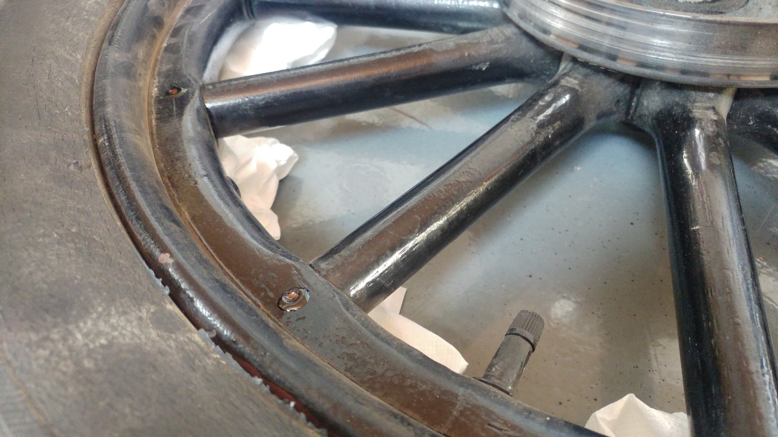 - Make a kneel of cleaning paper and place it below every spoke end and wooden felloe to catch oozing Epoxy. Big open gaps I would close before with some plasticine before.