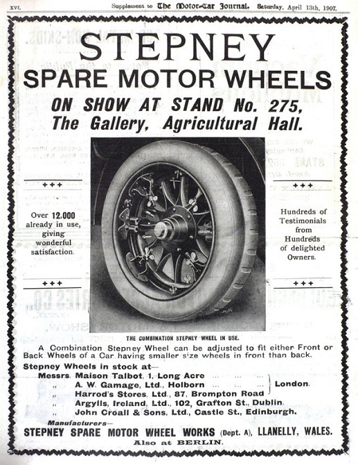 “The Stepney Spare Wheel for motor cars was invented by T. M. Davies in 1904. With his brother Walter, T. M. Davies owned an ironmongery business in Llanelli. At the time, cars were made without spare wheels and T. M. Davies had the idea of producing a clamp-on device to act as a spare wheel. The invention was instantly popular and produced in numbers at the Llanelli factory. Sales abroad were aided by agencies and later a tyre factory in Walthamstow. From 1922, the company became the Stepney Tyres Ltd and the Llanelli factory closed, as manufacturers began to supply spare wheels with their motor cars.”