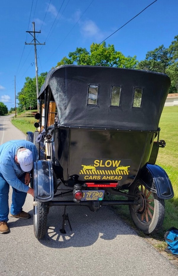 I spent last week on the MTFCI National tour in Cadillac, MI. On our tour to the lake Michigan shoreline community of Manistee I got a flat tire, the first one in over 10,000 miles of driving my 1917 Touring. The tires were Universal T Drivers, which had been on the car for the 10,000 + miles. I posted a photo and narrative on a local Michigan Model T FB site thinking those who knew me would get a chuckle out of my situation. It went viral, and at last count had over 345,000 views, mostly from outside the Model T community. Needless to say, I was surprised by the interest.