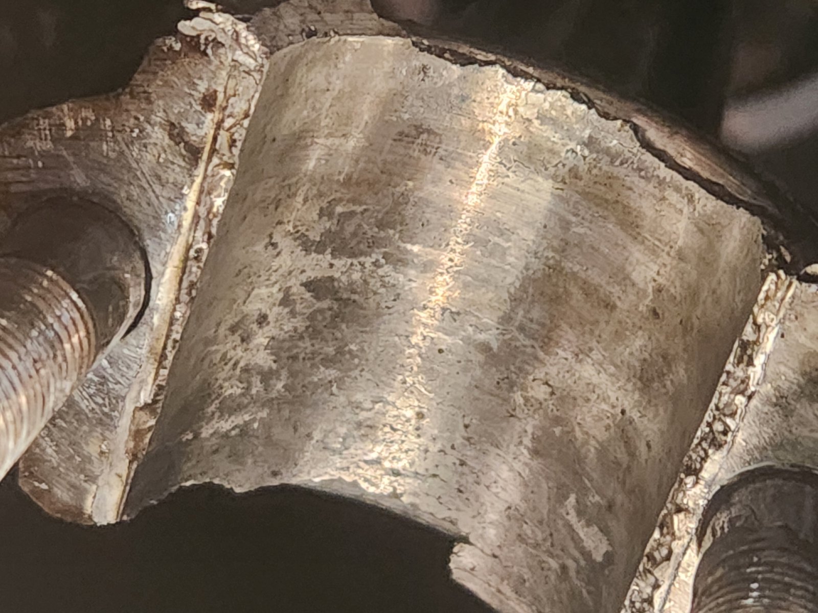 Ok so I took the inspection cover off, there were a few small chunks of Babbit in the dips (4 dip pan). I took the front rod cap off and it looked OK but the babbit in the rod itself was crumbling on the edges (see photographs), luckily the journal looks to be in good shape although I haven't measured for taper or out of round. I must also add that I fitted a mag post oiler and I try and run with a little more oil because of the hilly country. This car is also a daily driver and I put probably 300 miles on it this summer so I'm amazed that it held for so long. (maybe 45mph down the Truckee River was a little excessive but I'm 19 what can you expect lol)
