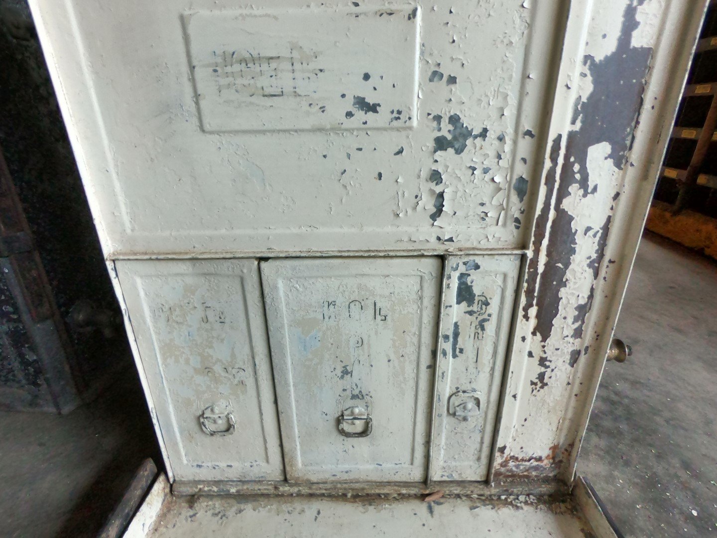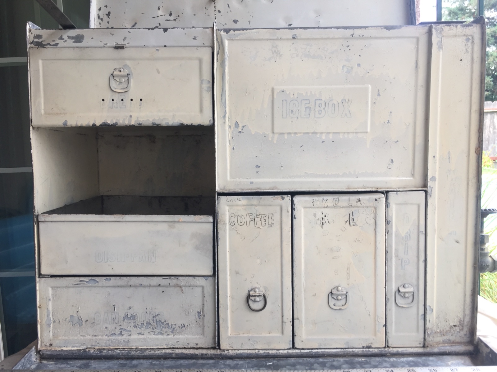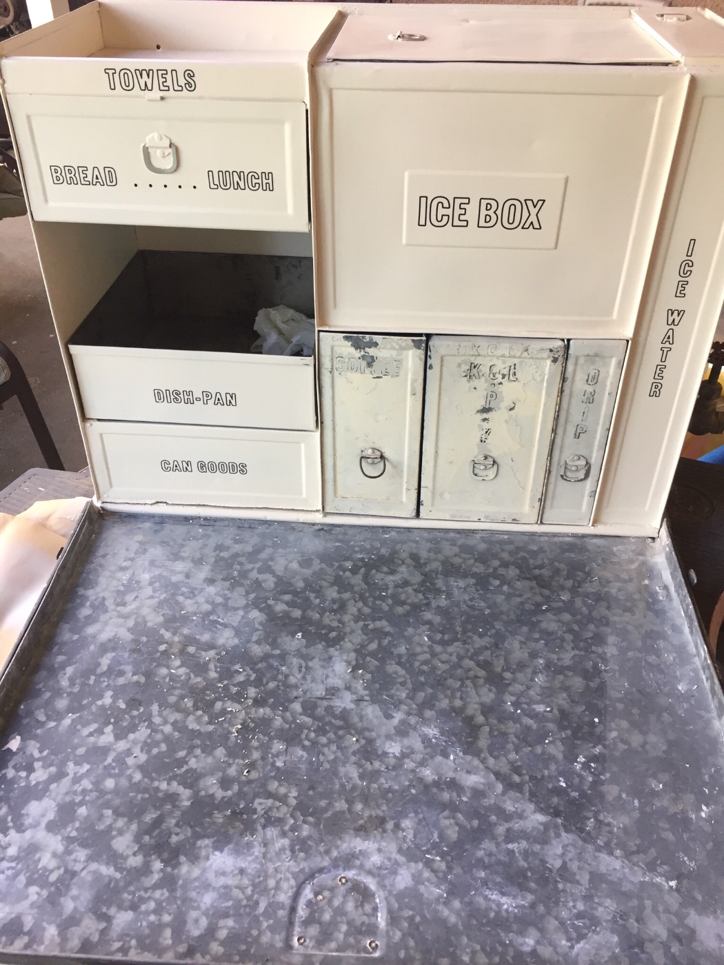 5. The photo of the front of the small kitchenette shows the letters I was able to reveal with lacquer thinner and steel wool. It is possible to read all the words except the ICE WATER tank letters. But it is reasonable to assume that is what was used on the tank as the other two sizes also used ICE WATER letters.