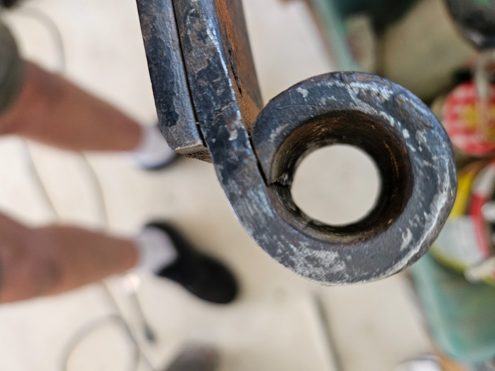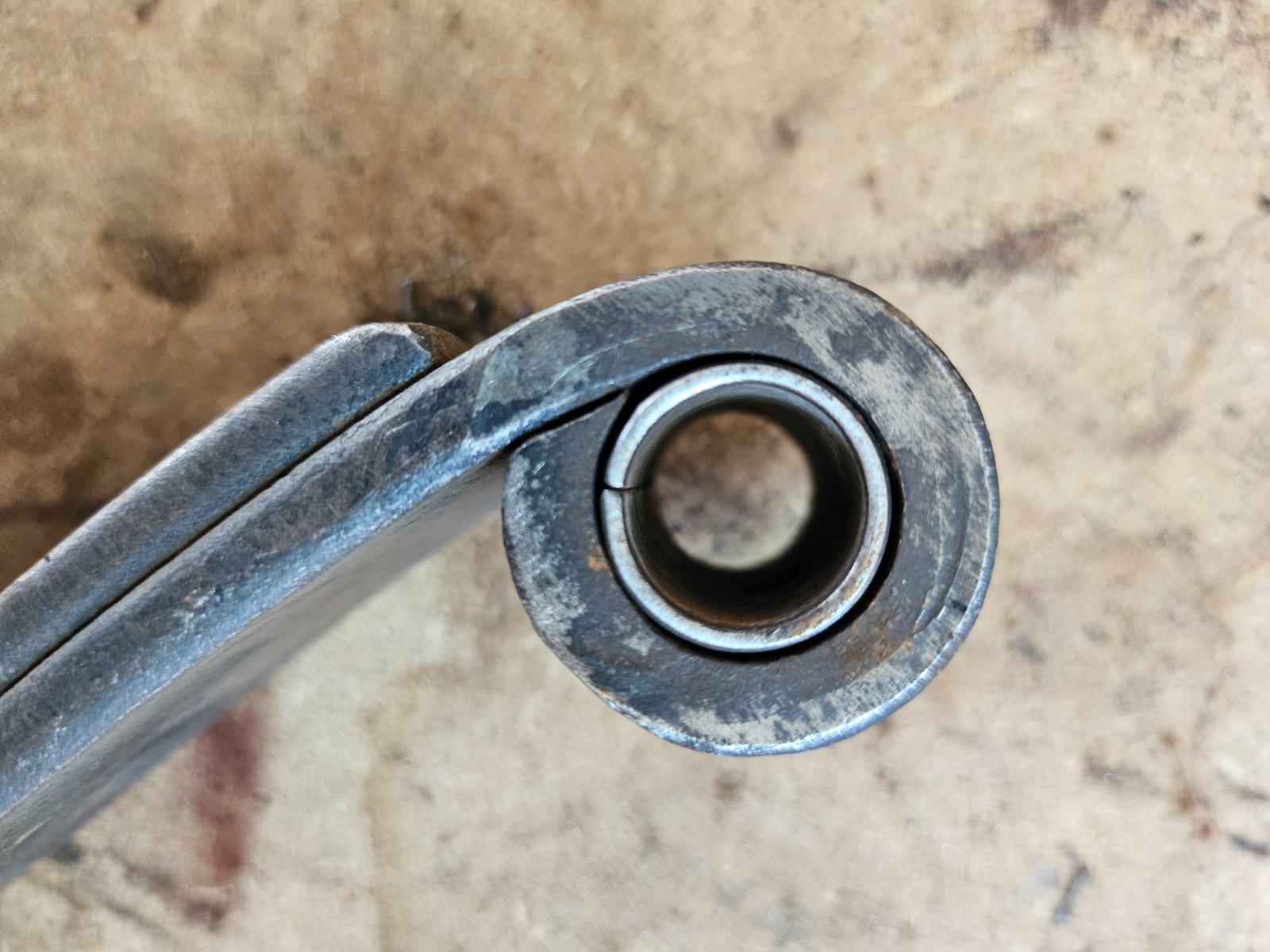 The old bushings were steel, and showed little wear, certainly not thinned/worn thru to eat into the spring steel. Upon closer inspection it appears that at some point in her life that did occur, but, not to the extreme I have seen some springs, but, it is slightly ovaled out on the top side..... ... just enough to open up tolerance where the bushing is no longer a press fit....and...enough where I can spin the bushing with my fingers.