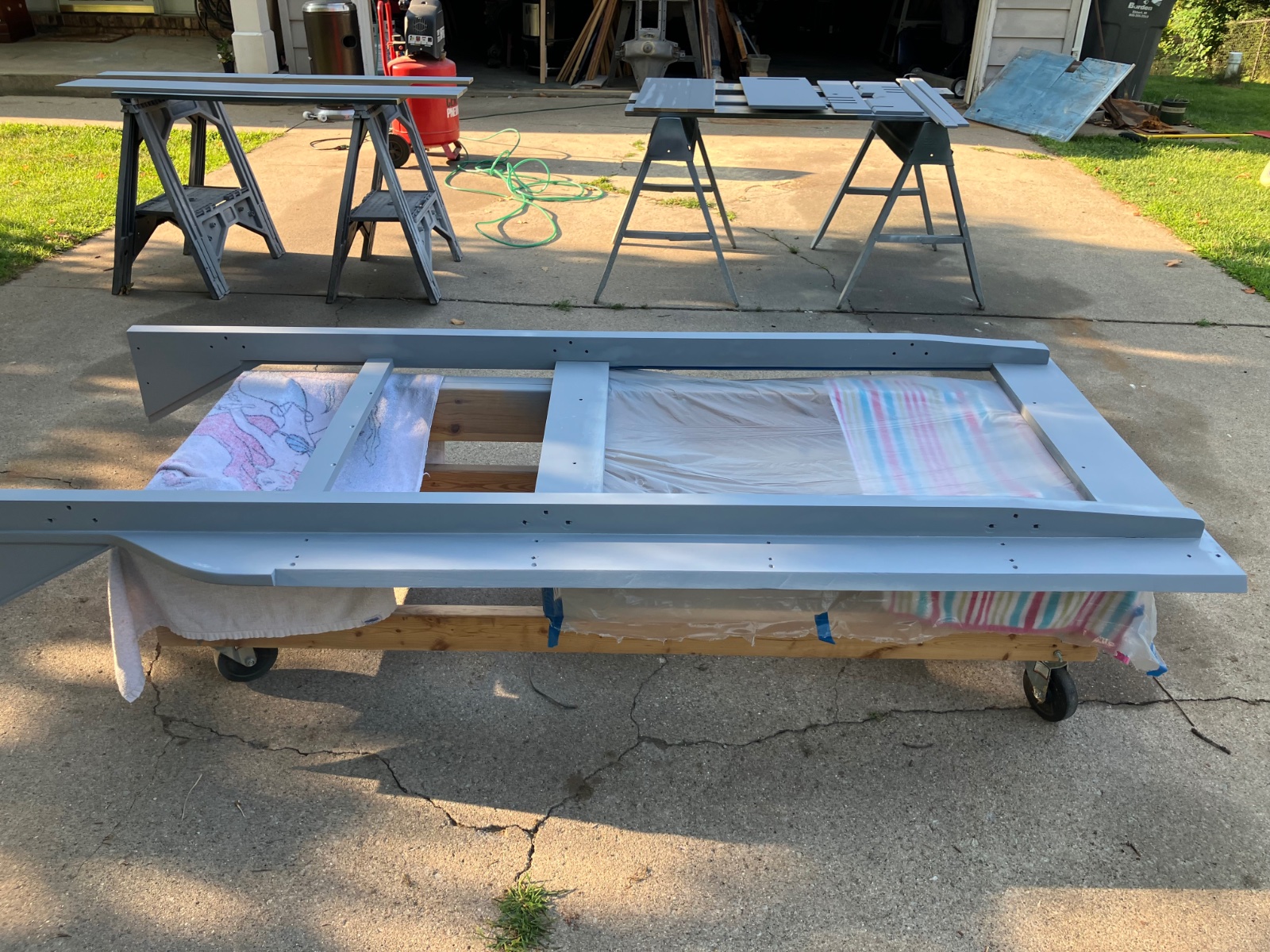 I’ve been varnishing, varnishing and more varnishing interior wood pieces for the delivery car. I also got the platform ready for primer and paint.