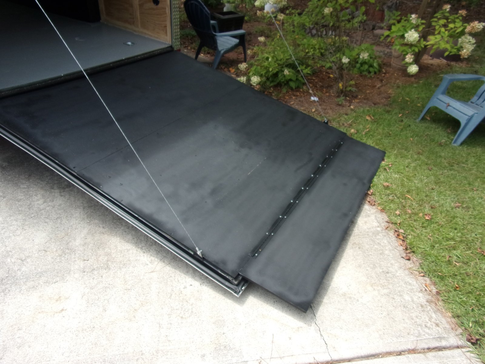 Rear tail gate ramp and extension were coated with bedliner. Duct tape at end indicates tire initial line up position and pool noodles over rear door cable keeps me from walking into them.