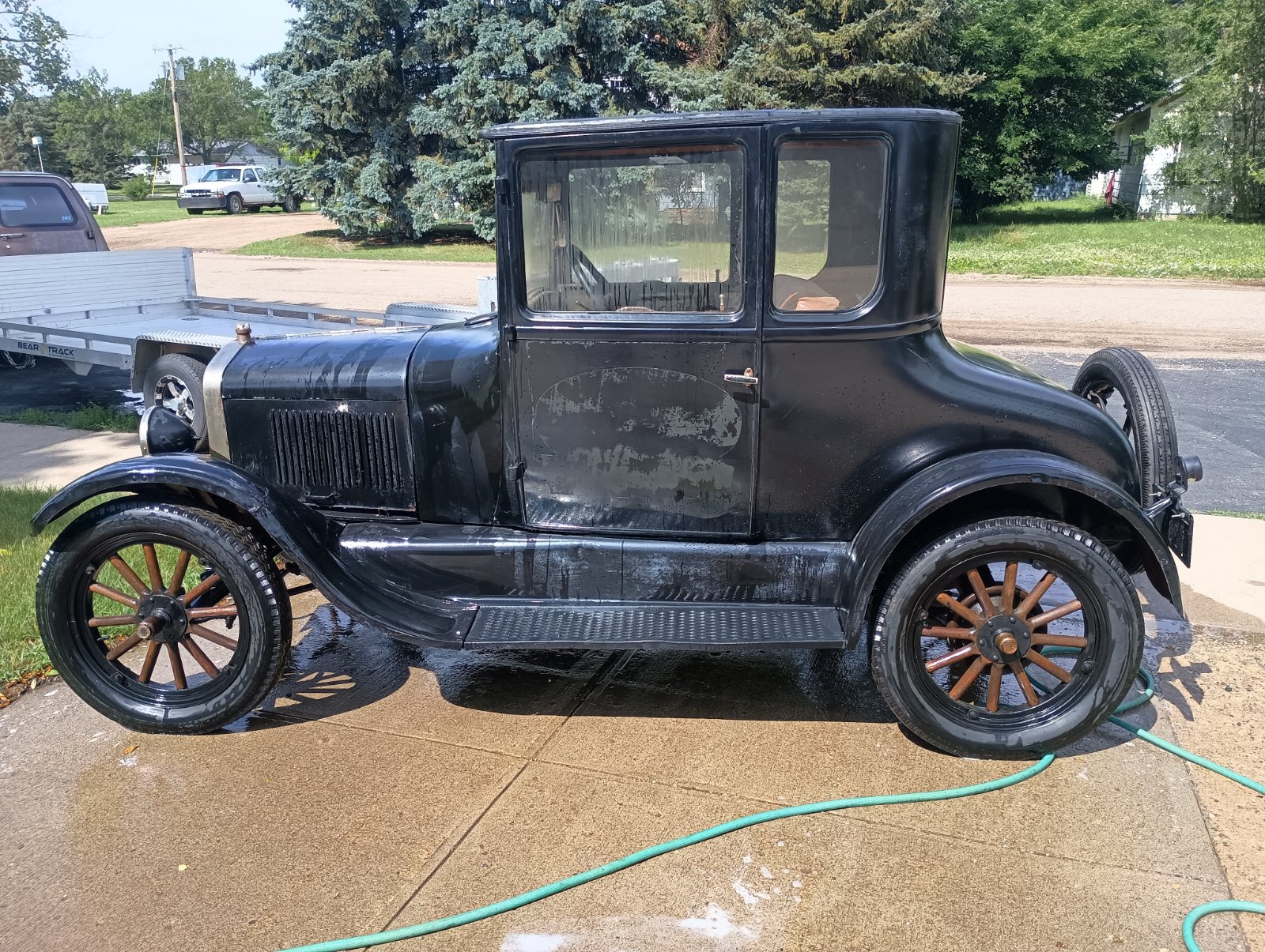 I noticed that you washed your car with a hose. Be careful that water does not flow down the window into the door where it can remain and rust out the door from the inside. That is why I always hand wash my T with a soft rag never allowing water get into the door. Also, in the 54 years I have owned her, I have never driven my car in the rain or parked it outside if it looked like rain. Congratulations and good luck. Jim Patrick