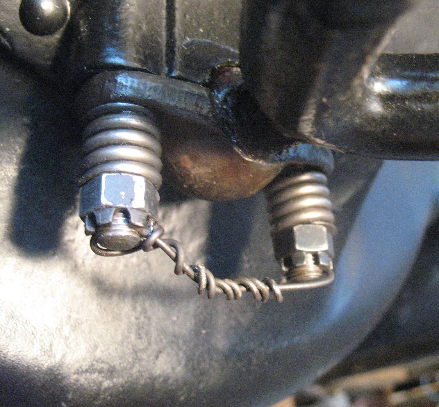 In the photos Steve posted, the springs are almost coilbound, ie compressed to the stage they have nothing more to give. The nuts should be wound on just enough for the wire to be installed. That way the spring is left slightly more relaxed, a.nd able to move with the flexing/twisting of the frame.