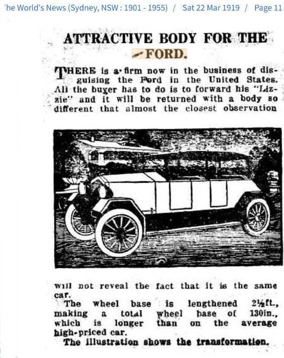 Some time ago I found reference to a new body for a Model T which had become available in 1919. The "design" if thats what one would call it if nothing else is "different'. The Australian news paper the report was in was as always the case never mentioned any actual details only saying " There is now in business of disguising the Ford in the United States.