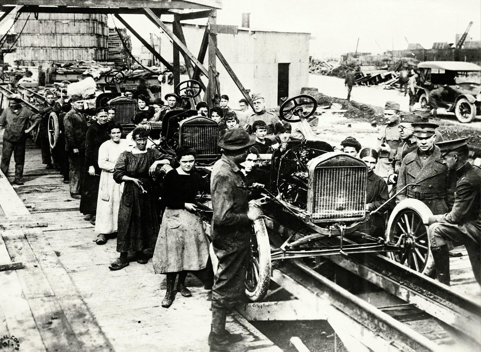 This photo has appeared on ebay, it shows women and men working on Model T's at what appears to be an emergency assembly line during or after the first world war.