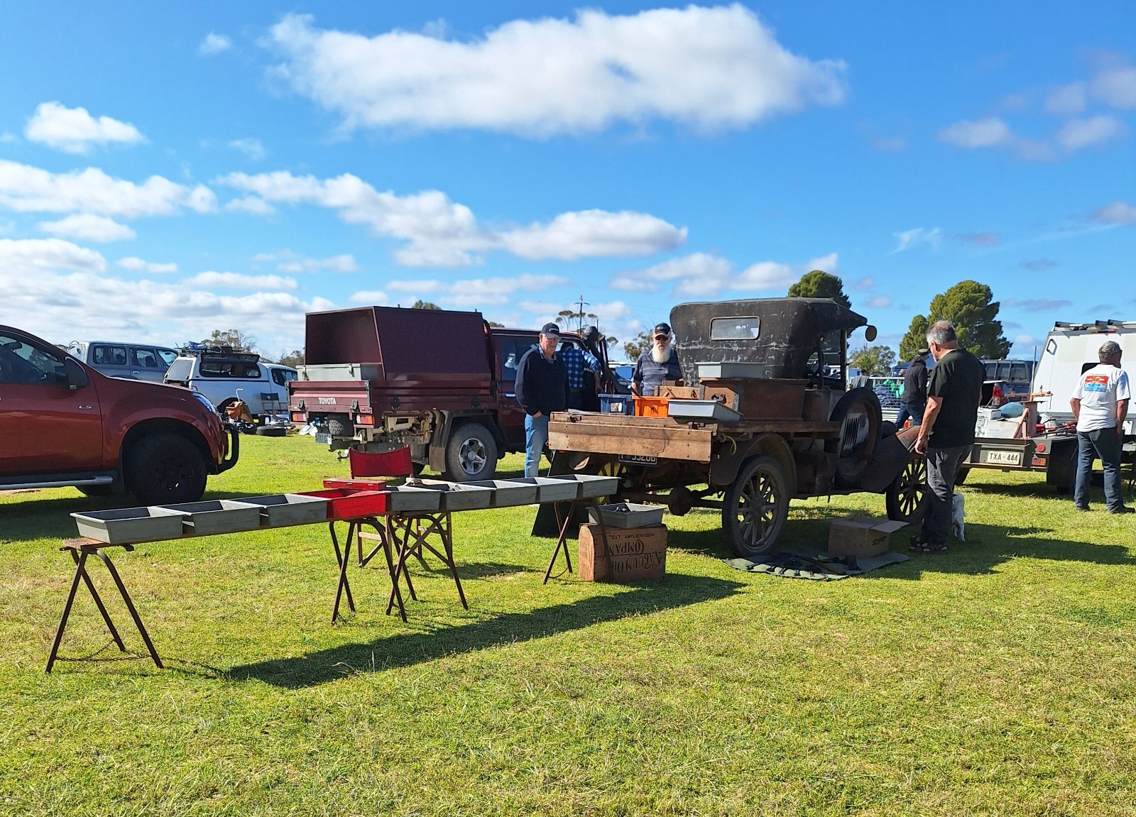 I took Henrietta to the Morgan swap meet last weekend. The tubs are set up on her side boards from the trayback, all stocked with hand tools far sale.