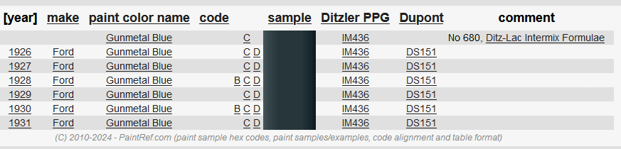 I believe that Washington Blue (IM1246) was a Model A color. The 1926-7 Model T "blue" was Gunmetal Blue (IM436). In searching for color chips (almost impossible since photos to computer screens never render the same) some car photo's made the two colors look very similar. Also it appears that the same name like "Gunmetal Blue" has different IM paint codes for different year cars:IM436, IM1551,Wingnut wrote: ↑Sun Sep 29, 2024 10:19 amHello all, I have a '26 touring I'm planning on putting wires on and was looking for any input as to colors. The car is two tone Washington blue w/black fenders, it has natural woods now. I'd like to use straw maybe, but what, in the vast think tank, does that equate to. advice is sought and considered. Thanks in advance, Wingnut
