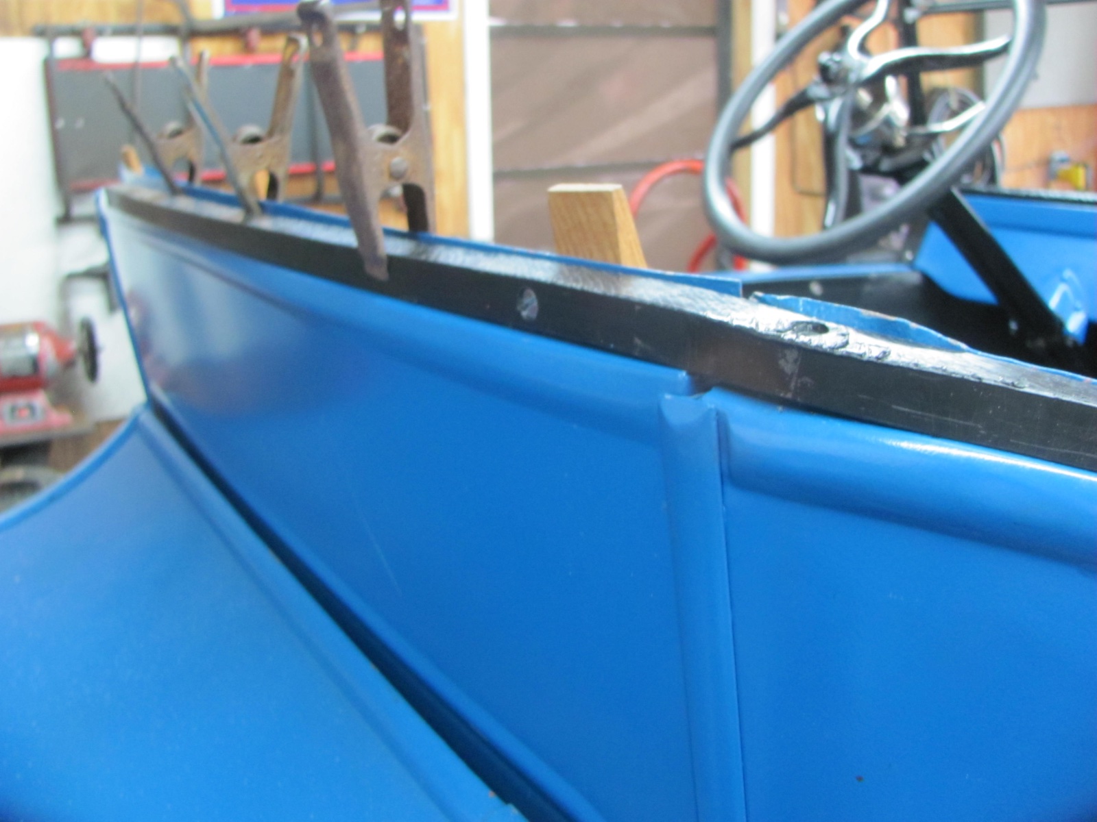 After a lot of searching of pictures of 23, 24, and 25 touring cars, and studying mine, I was convinced that there should be a curved rear panel. The cars that show a completely flat rear don't look as nice to me. Mine is clearly slightly curved. curve back tack strip.jpgThanks for your confirming my suspicions. A curve belongs there. Here's the line for my rear. You can clearly see a slight bend. I'm so glad I got that issue resolved.