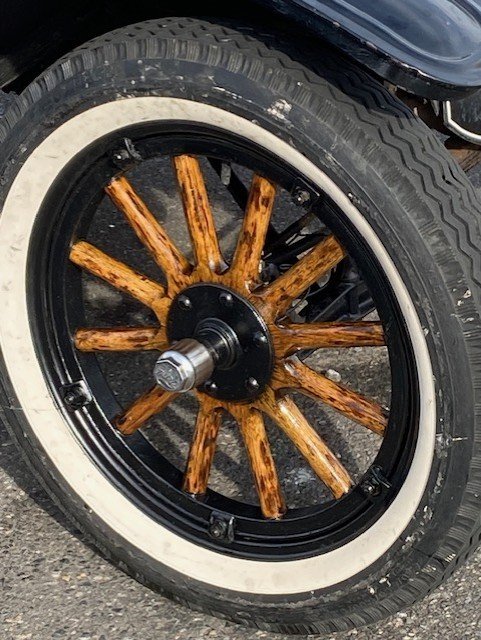 There is nothing wrong with your current wheels other than the fact that they should be respoked sometime by a professional. It's not important that they're non-Ford, or have an odd arrangement of rim lugs, or confuse people. It only matters that they are in good & safe operating condition. Their only fault, (that can be seen here), is that they've been installed incorrectly.