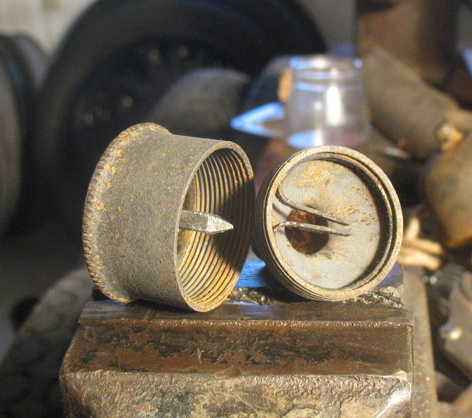 John's leather "keeper/seal" was likely enough to keep the cap in place originally. It would be nice to be able to replace them, but they appear to be fixed in place by upsets made when the hex was formed above the thread. I can't see any way of replicating this. Perhaps you could put the cap over a wooden broom handle and make a small inwards divot with a centre punch, so that the divot is tighter on the thread.