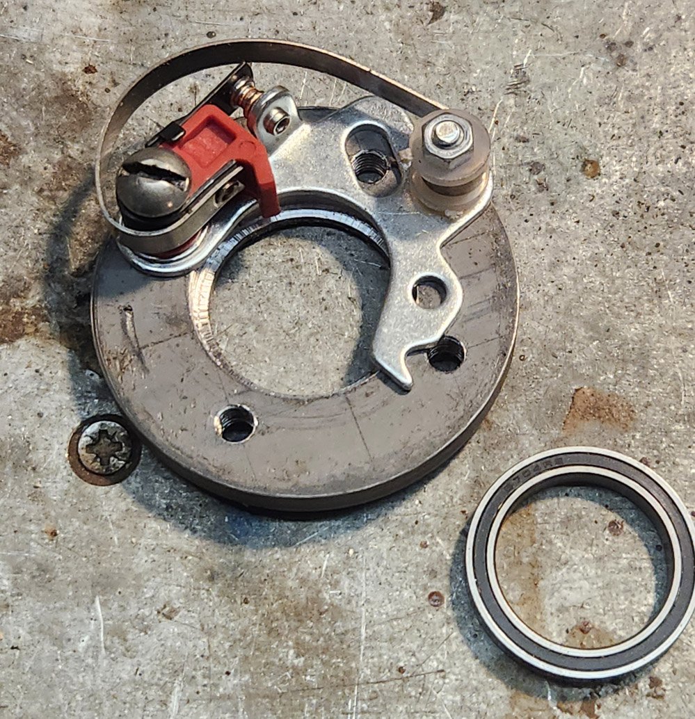 I built two new timers, both using readily available Lucas contact breaker points. One has them mounted around the periphery of the casing. This works, but there's still inter-cylinder variability.