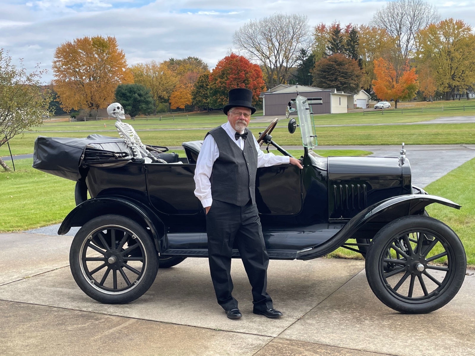 I was scheduled to drive the bride and groom in a friend’s wedding on October 26, so my wife got busy on Amazon and got me properly outfitted. Being so close to the end of October, the bride’s theme was Halloween and requested the skeleton (which I moved to the shotgun position for the actual drive).
