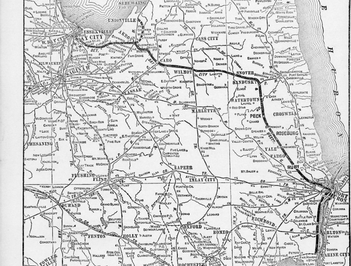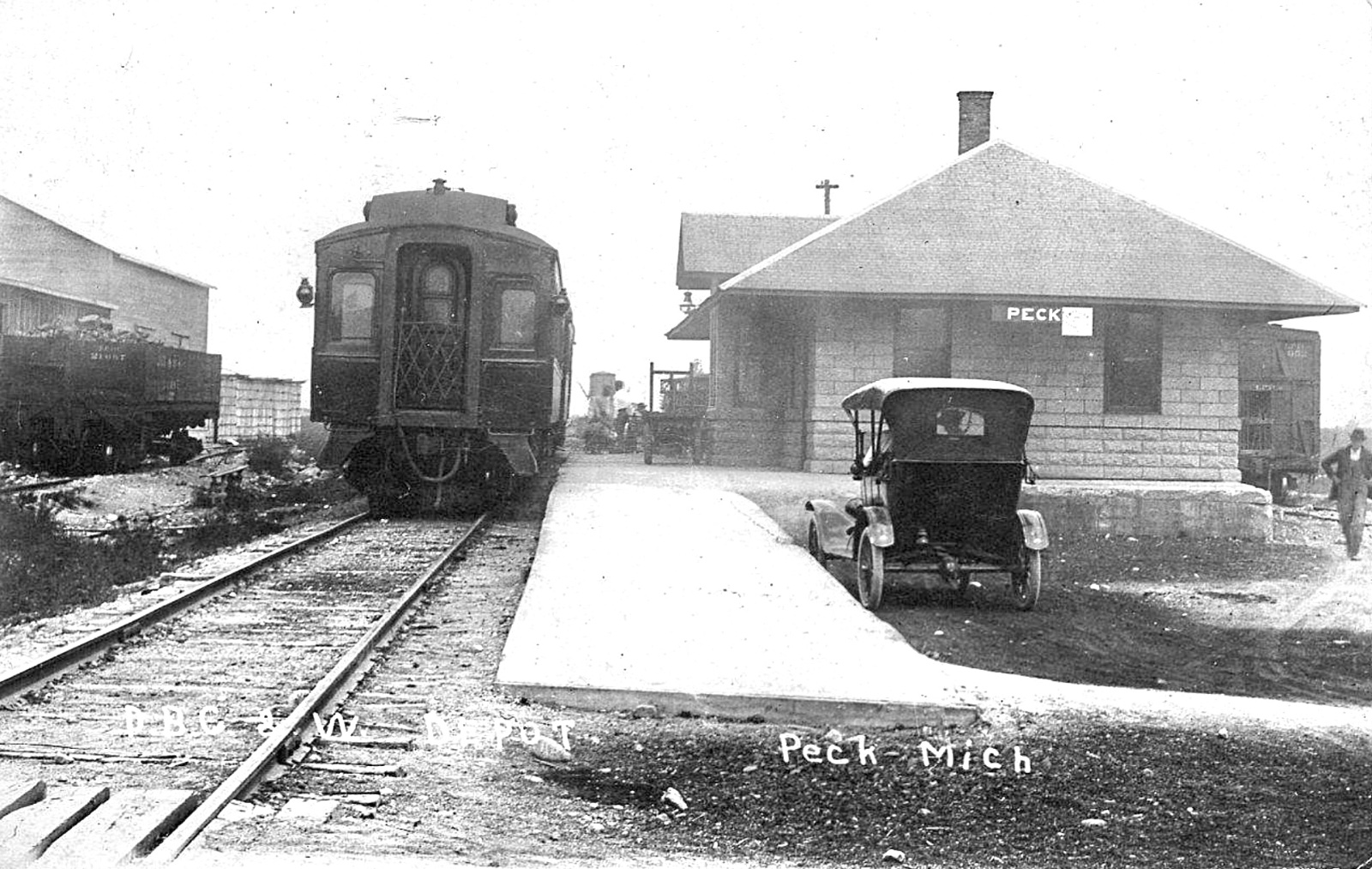 That shot of Peck, Michigan (which is in my county) shows the Detroit, Bay City & Western Railway station. The line from Peck to Port Huron was completed in 1916. Long gone now.