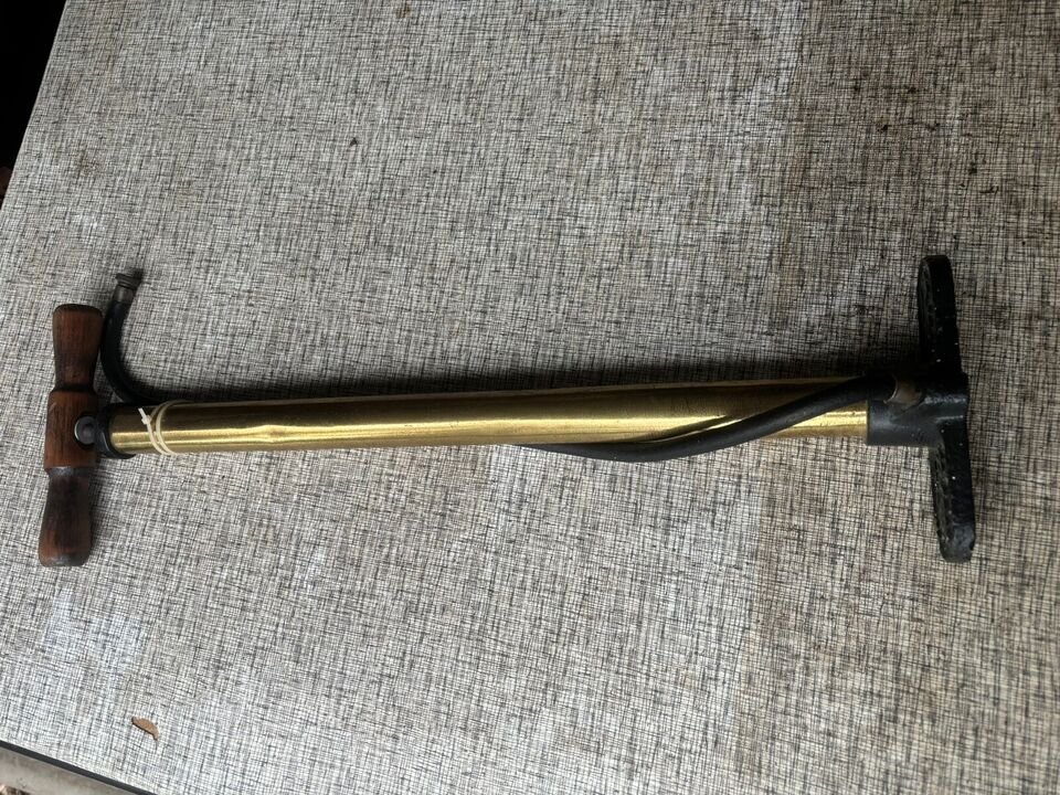 The tire pump is indeed Ford Model T. The brass looking tube is solid brass. The base and the cap are painted cast iron. The pump shaft is steel...if that helps.