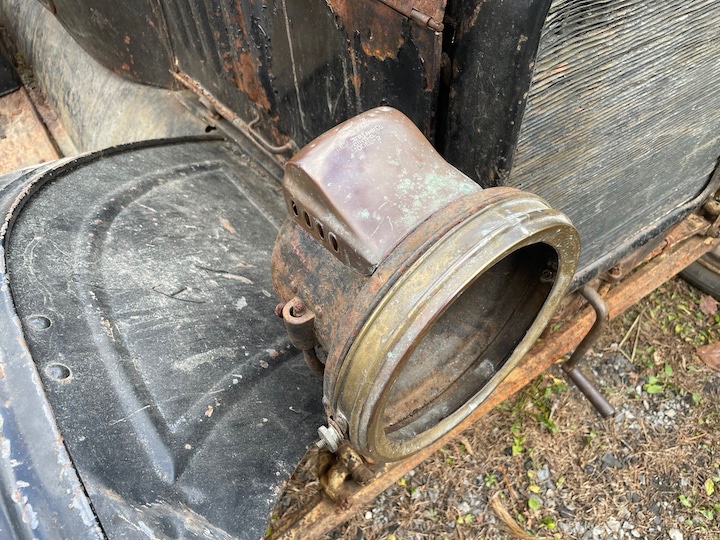 Looks like a Johnny Cash car. Note the rear wheels are not de-mountable. However, it is typical of many cars which, when something broke down they went to the wrecking yard and bought something which would work and mounted it on the car. Could be that at sometime, the magneto quit working so they put on the gas lights because that car did not come with a starter and battery but the lights were powered by the magneto. The ignition would run for many miles on a charged battery.
