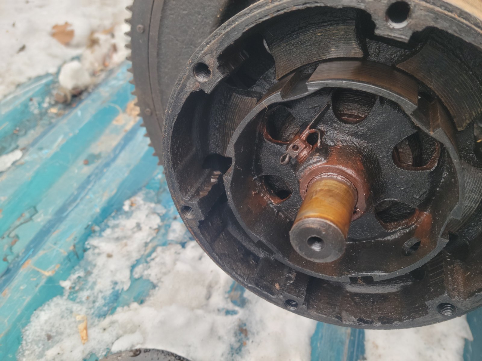Note the sharp edges on the brake drum. That would have chewed the edge of the band lining. As previously stated, the drive plate edge becomes part of the brake drum surface. Not obvious because of camera angle, the drum width as pictured is a good 1/4" to narrow.